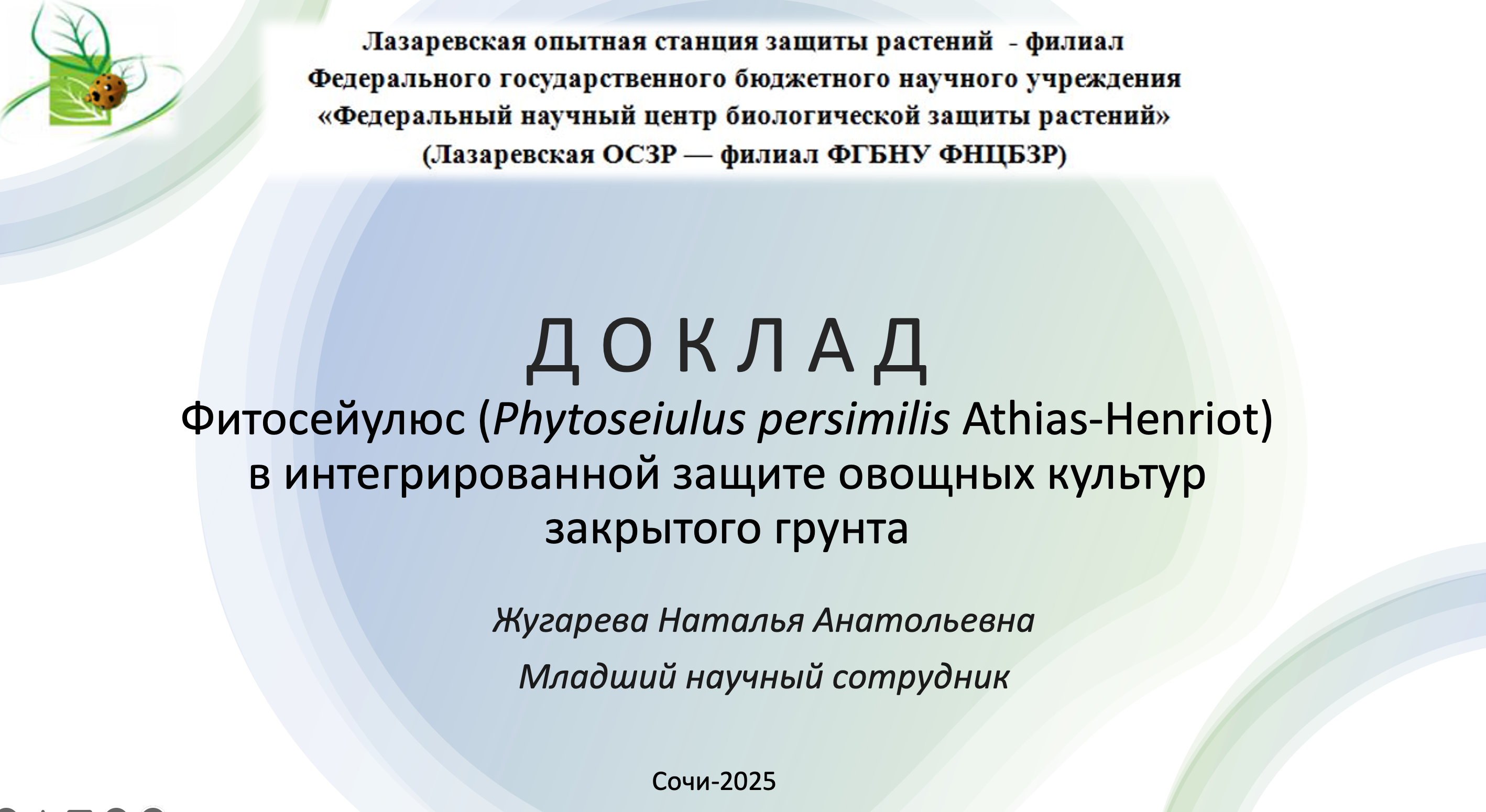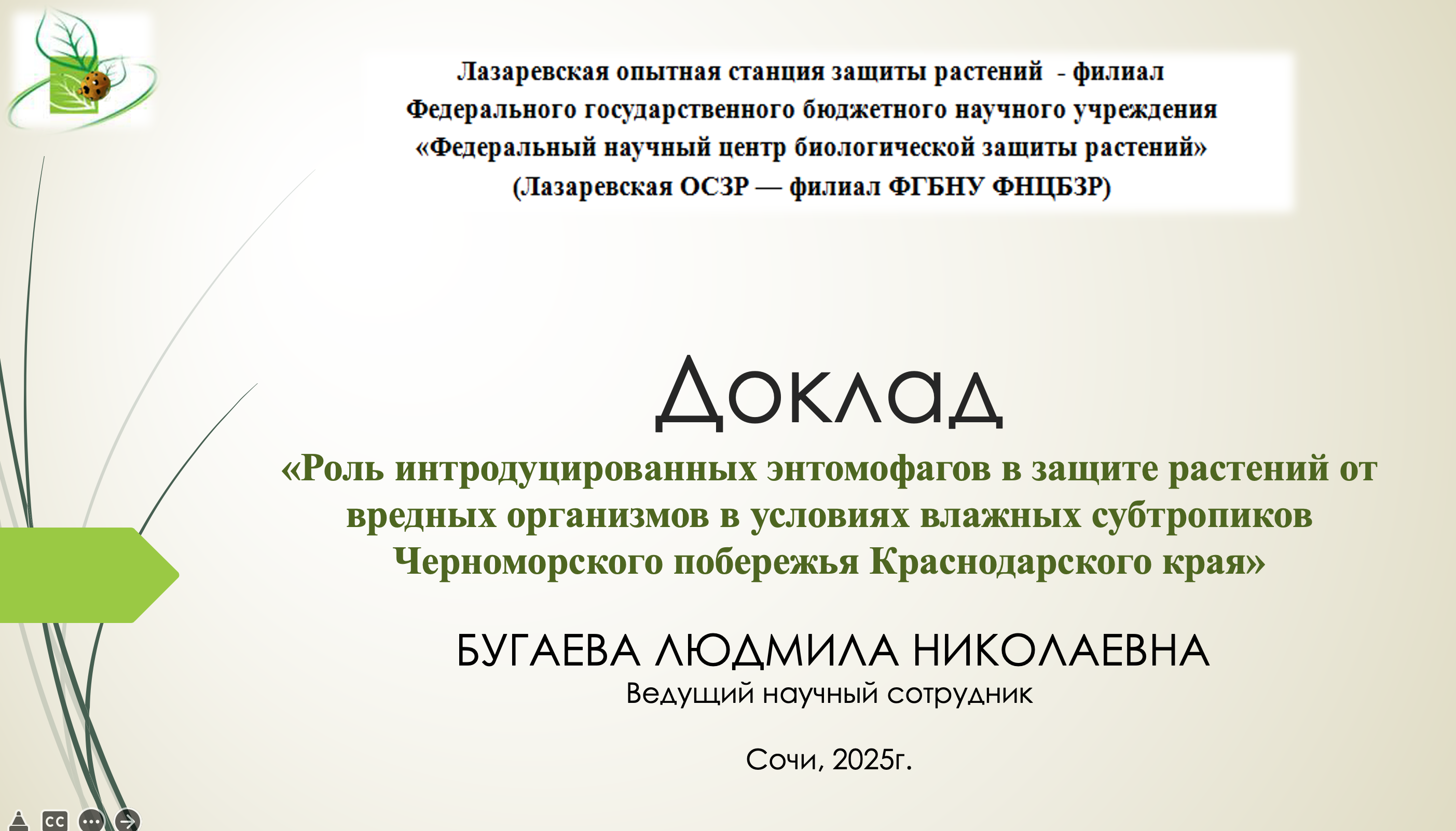 Научные сотрудники Лазаревской опытной станции приняли участие в работе XII Международной научно-практической конференции «Защиты растений от вредных организмов» на базе Кубанского государственного аграрного университета им. И.Т. Трубилина, секция 6 «Биологические и бирациональные средства защиты растений – основа восстановления гомеостаза», в дистанционном режиме работники станции представили результаты масштабных исследований, лабораторных испытаний и практического применения биологического метода защиты растений, являющегося основной составляющей фундаментальных и прикладных работ научного сообщества по насыщению видового состава агроценозов полезными организмами. Ведущий научный сотрудник Бугаева Людмила Николаевна, к.б.н. в своем докладе описала «Роль интродуцированных энтомофагов в защите». Директор, старший научный сотрудник, Кашутина Евгения Викторовна, к.т.н. выступила с докладом «Биологический метод защиты растений от вредных организмов в условиях влажных субтропиков Черноморского побережья Краснодарского края». Ясюк Лариса Викторовна, младший научный сотрудник Лазаревской опытной станции продемонстрировала выявленные особенности использования паразитических энтомофагов в системе защиты овощных культур. Младший научный сотрудник Жугарева Наталья Анатольевна описала хищного клоп фитосейулюса как объекта биологической защиты в интегрированной системе защиты овощных культур закрытого грунта. Игнатьева Татьяна Николаевна, старший научный сотрудник выступила с докладом «Кокцинеллиды в защите овощных культур от комплекса тлей». На секции были заслушены более 40 докладов сотрудников ведущих научно-исследовательских учреждений из разных регионов России и стран ближнего зарубежья.