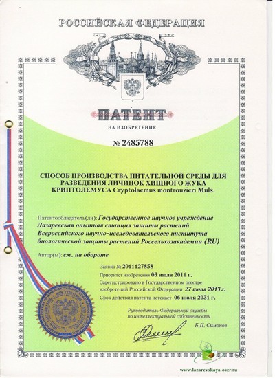 Способ производства питательной среды для разведения личинок хищного жука криптолемуса Cryptolaemus montrouzieri Muls. (изобретение).